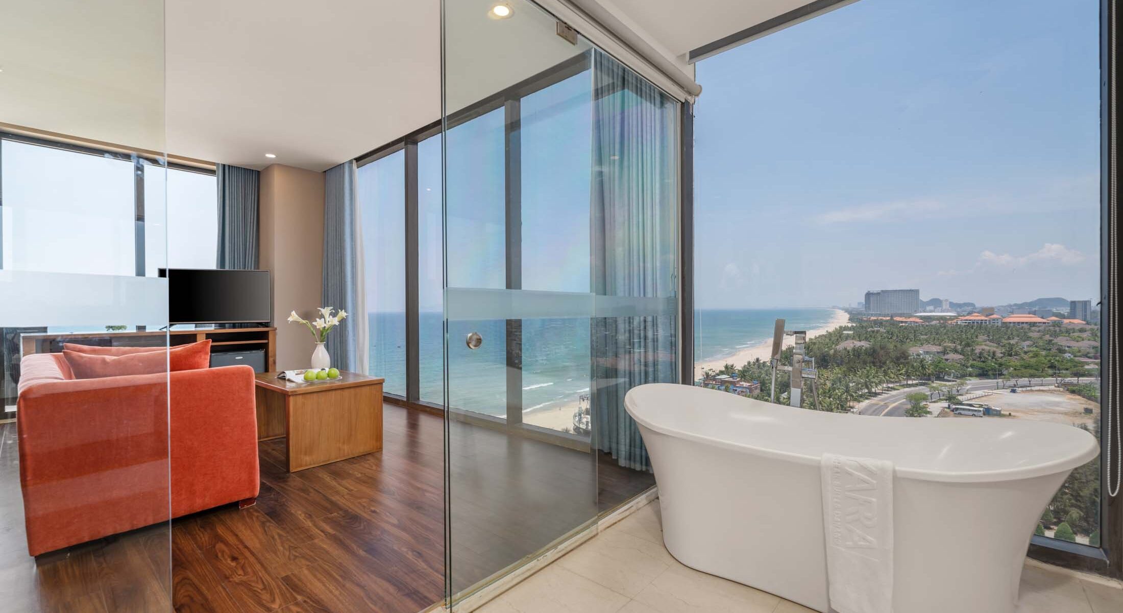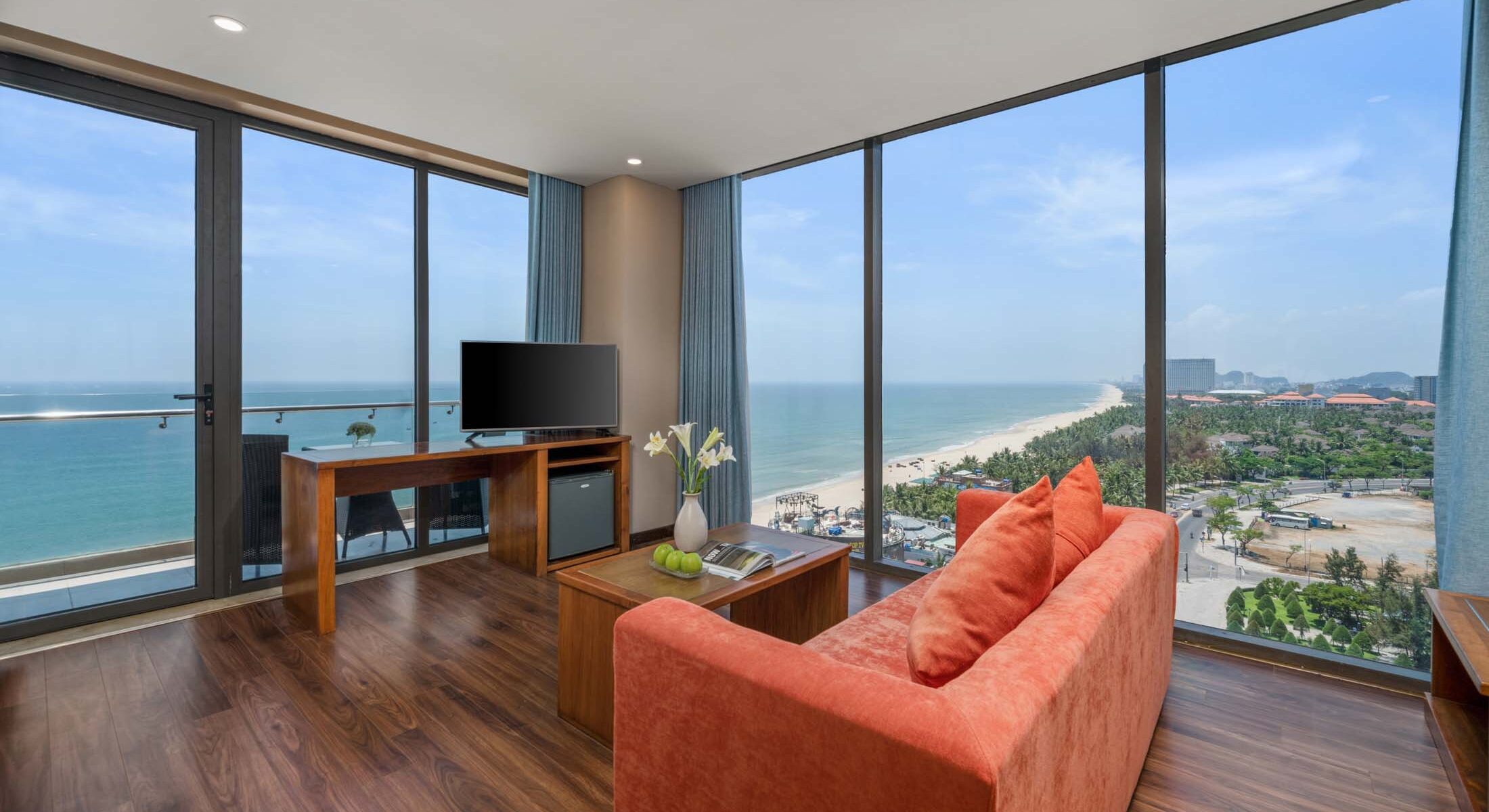 Tầm nhìn ấn tượng từ cửa sổ góc phòng với toàn cảnh hướng về vùng biển sóng vỗ hòa cùng không gian ấm cúng bài trí khu vực tiếp khách nơi bạn có thể ngả lưng nhìn ngắm Đà Nẵng cả ngày dài.